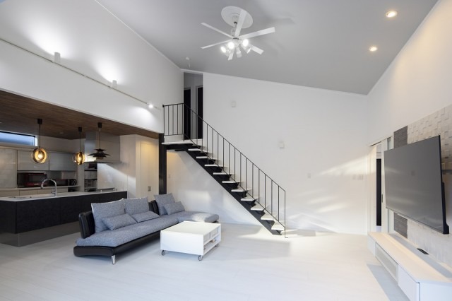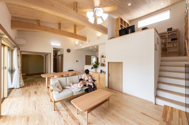 リビングの吹き抜けと中二階が印象的な和風平屋の家